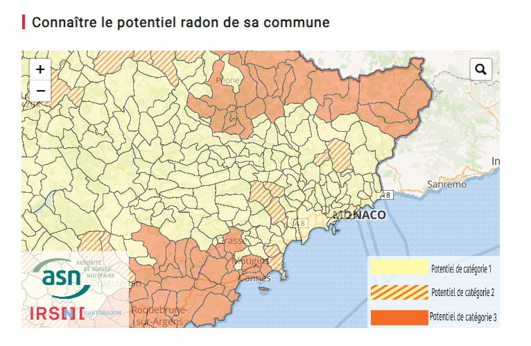Vous pouvez consulter la Carte de l’IRSN ou consulter la plateforme Géorisques : Fiche Radon – Géorisques afin de visualiser, en fonction de votre commune, si vous êtes "à risque d'exposition" au radon.