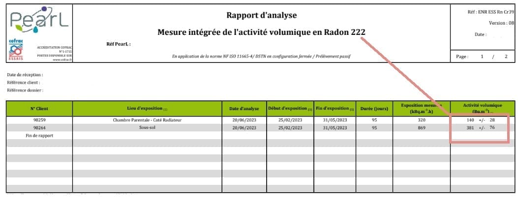 Lecture des résultats : Regardez la colonne "Activité volumique (Bq.m-3)". Dans l'exemple ci-dessous, le premier dosimètre a mesuré 140 Bq/m³ dans la chambre parentale, et le second 381 Bq/m³ au sous-sol.