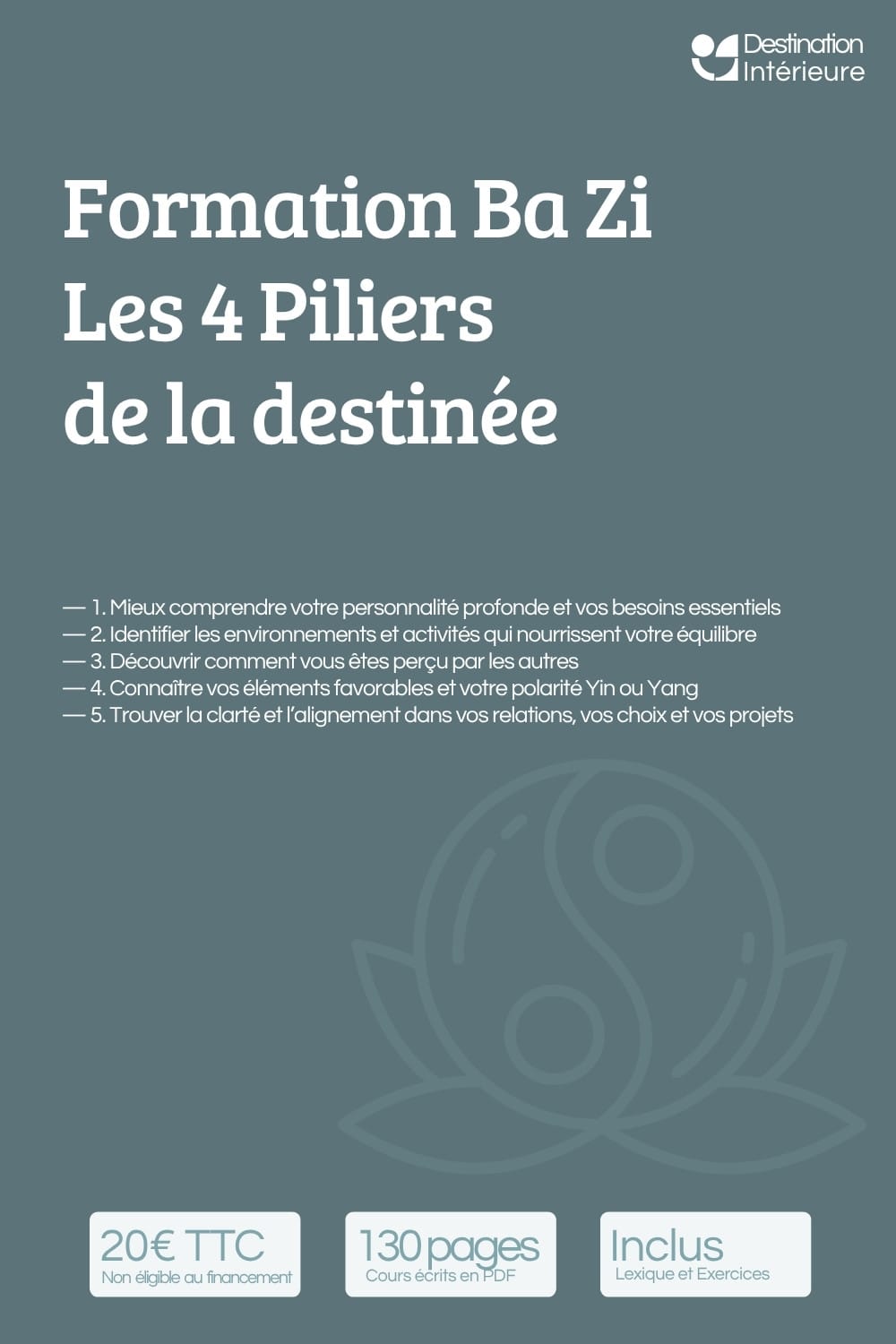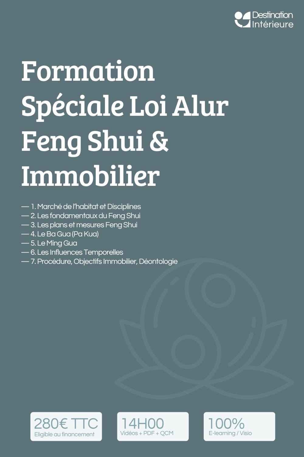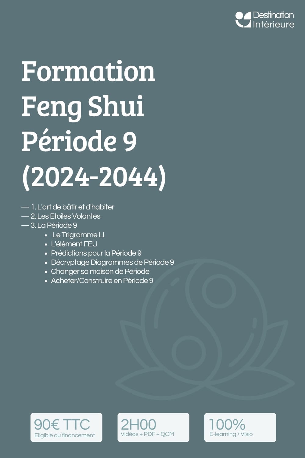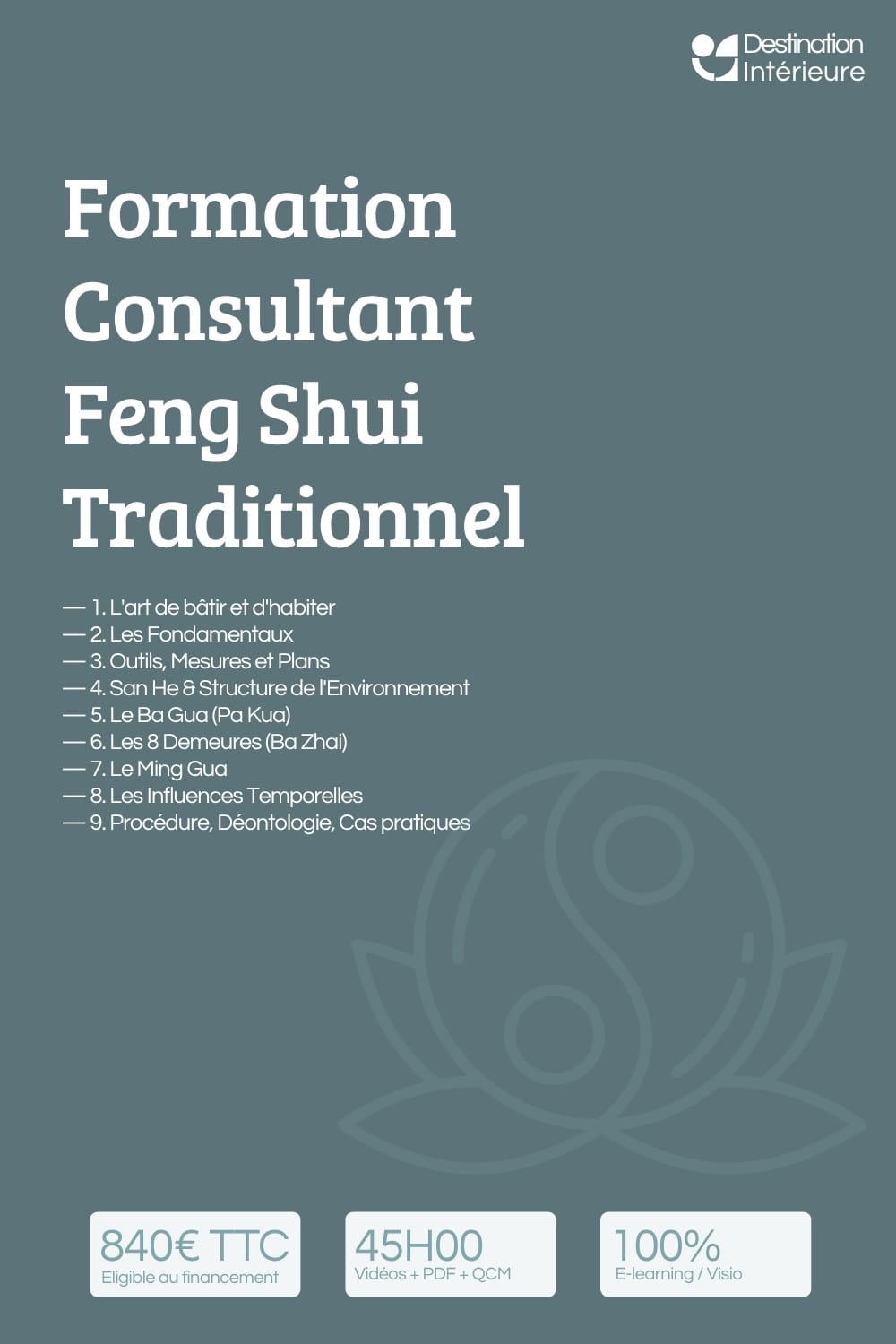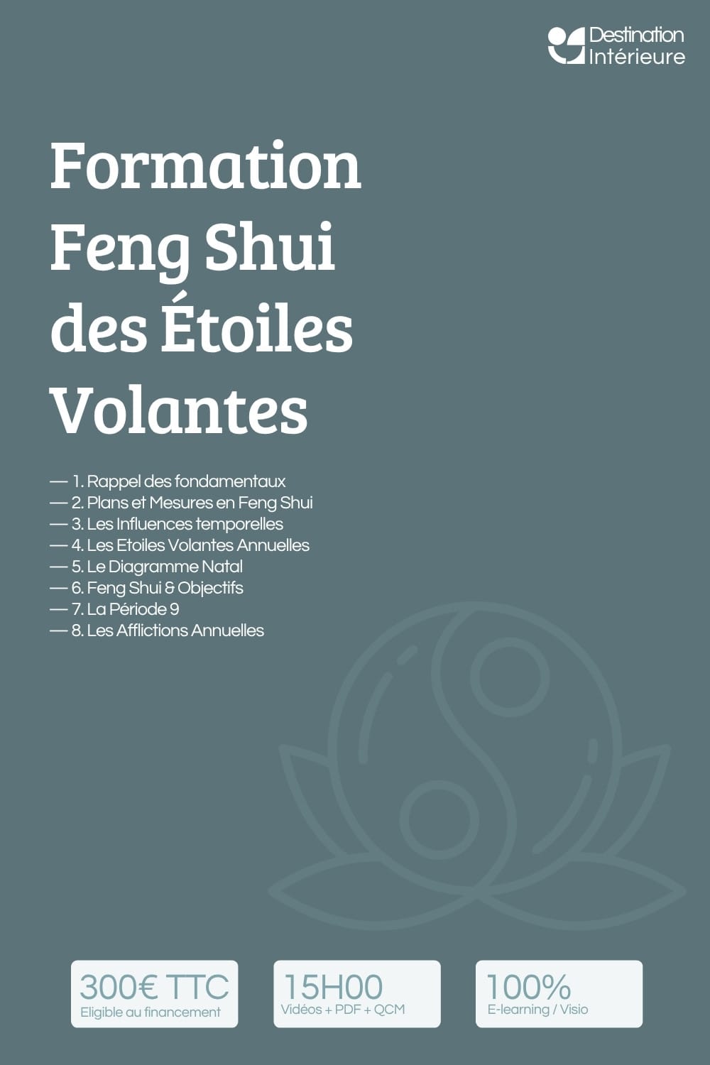 Les formations de Destination Intérieure sont des programmes e-learning structurés en feng shui traditionnel, conçus pour une progression rigoureuse — de la théorie à la pratique. Chaque formation est accessible en autonomie complète, avec vidéos, supports PDF, exercices corrigés et de nombreux quiz.
