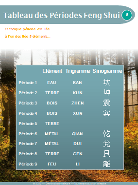 Un récapitulatif des 9 Périodes, de leur trigramme et de leur élément
