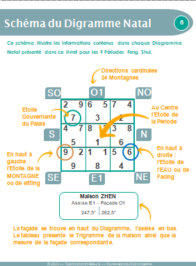 En feng shui des étoiles volantes, le diagramme natal d'une maison est le point de départ de toute analyse. Il dépend de la Période de construction ou de grande rénovation, et de l'orientation de la façade — ce qui génère 216 configurations possibles sur l'ensemble des 9 Périodes.