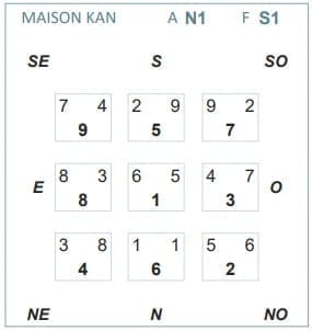 Au final, on obtient une carte très détaillée avec les 9 cases comportant chacune 3 chiffres ou étoiles qui déterminent l'ambiance énergétique de chaque secteur feng shui au moment de la construction de la maison.
